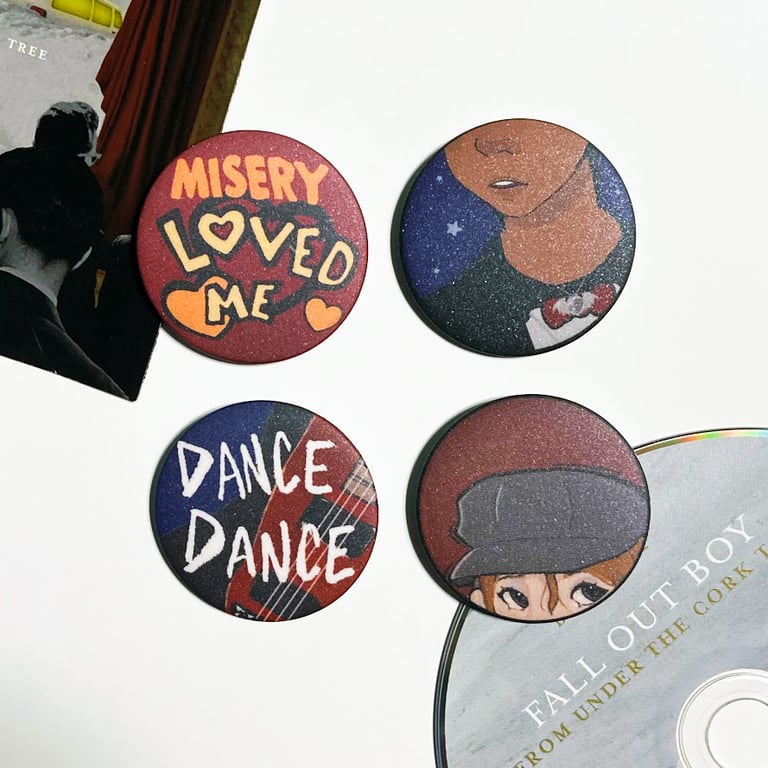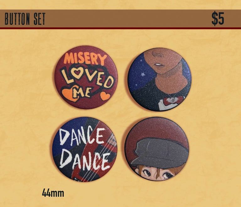 Button pins come in a set of 4 and have a subtly sparkly film over the top of the Dance, Dance designs by Ainsley Cat, who can be found on Instagram @whiskerworkprints and on Tumblr @cat-joshi. They're each about 44mm (slightly larger than 1.5in) big and have aluminum backing.